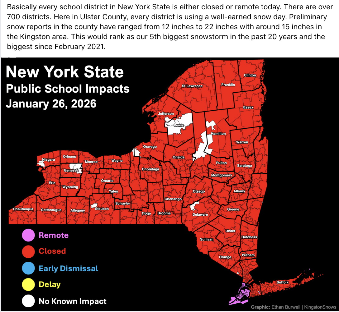 The roughly 14.9 inches of snow that fell in Kingston makes this the biggest storm since February 2021 and our 6th biggest snowstorm in the past two decades. Light snow will linger this evening, this combined with temperatures falling from the teens right now to the single digits means that even plowed roads will remain slick. Kingston City School District has already issued a delay for tomorrow. Following the comparable December 2020 storm, Kingston City Schools issued a delay the day after snow ended dispite the City of Kingston continuing its Snow Emergency. A similar situation is likely tomorrow, so the probabilities favor a delay; however, with the lingering snow showers and slick roads an upgrade to a closing is possible.